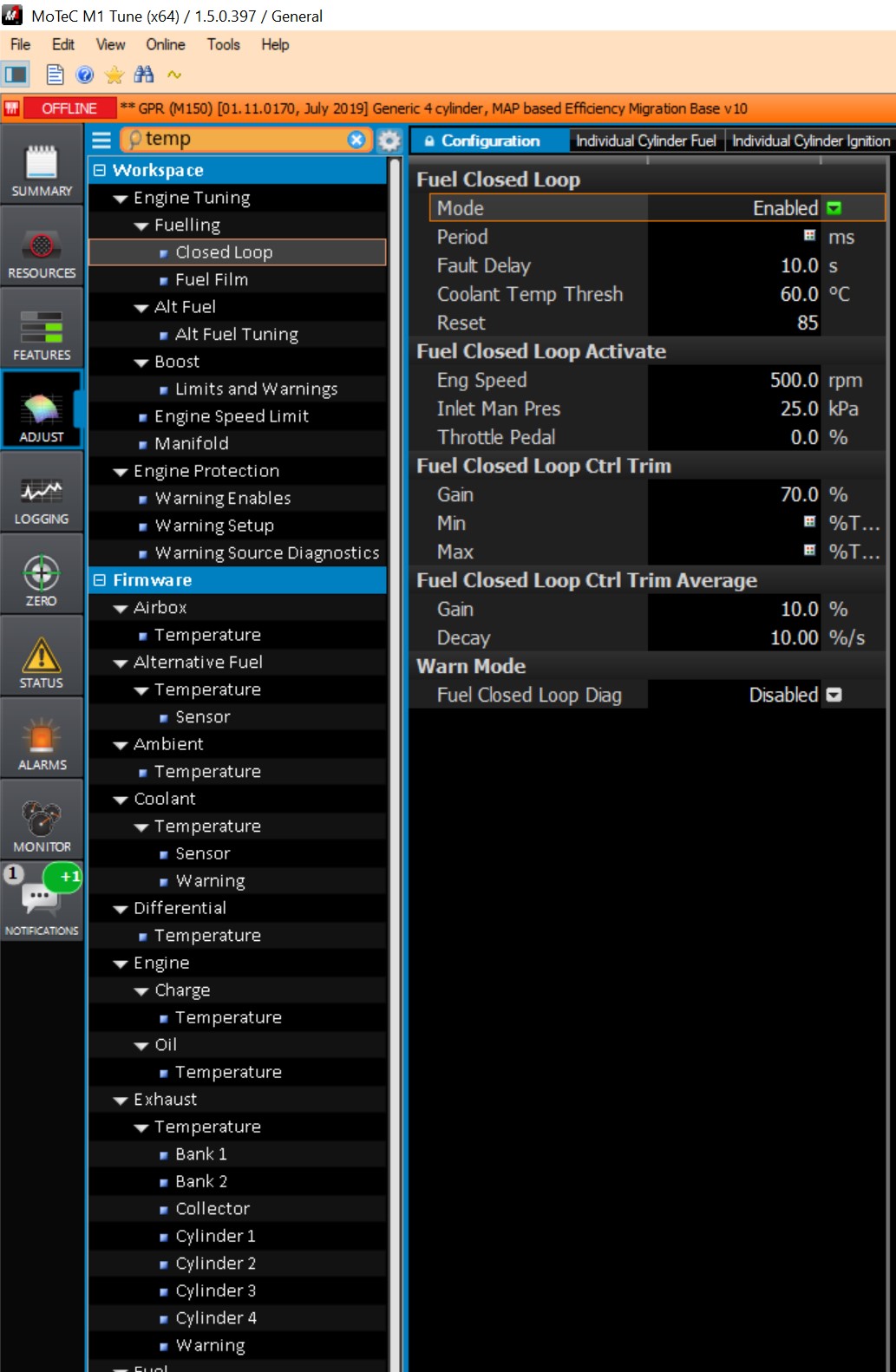 In the example below the keyword temp is entered, Tune has looked within the Adjust groups under the Workspace header and found the first instance of the word.