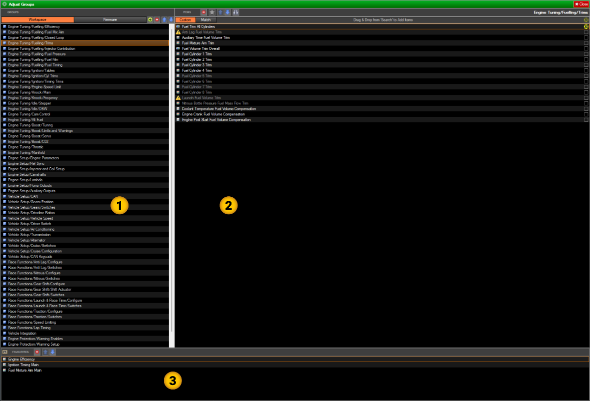 The M1 Tune workspace may be configured to suit the requirements of firmware developers and tuners to suit any particular work flow or firmware.
