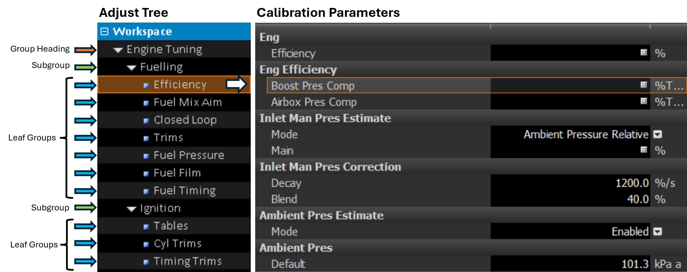 When customising the adjust groups or defining a custom workspace from scratch to suit a custom firmware, there are several rules that need to be adhered to, to successfully build an Adjust tree.