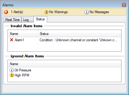 Ignored alarm items are not triggered and they do not appear on the Real Time tab or as a notification on the Status Bar.as seen above the High RPM and Oil Pressure alarms are in an ignore state. Double click the entry to remove the Ignore status and return the alarm to the Real Time tab.