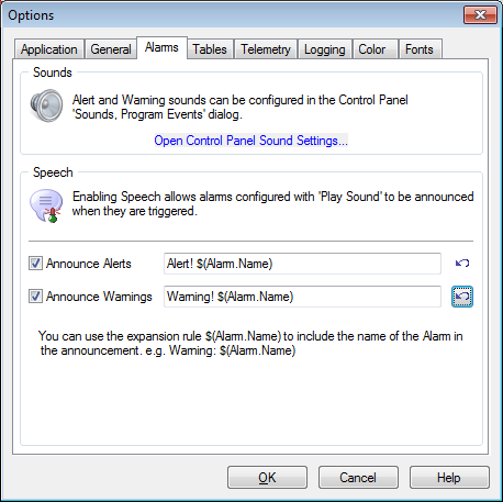 Select Tools > Options and go the Alarms tab, see figure 1.