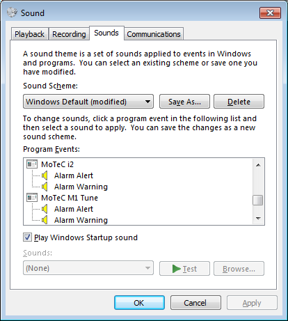 - Sound settings available from the Windows Control Panel (there is a MoTeC M1 Tune Program Event item available, see figure 2).