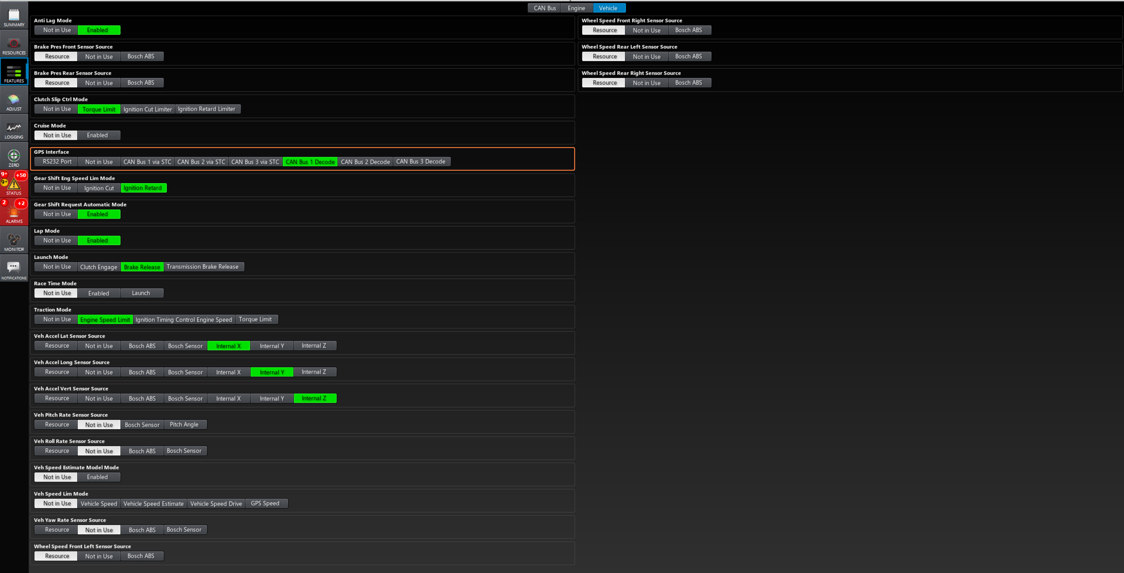 The Features view is a quick configuration Worksheet for Engine, Vehicle and CAN Bus parameters that have a toggle or selection mode available.