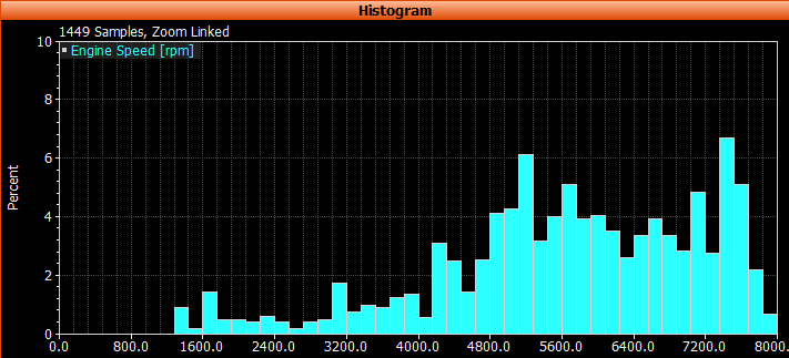 A common histogram shows the amount of time that an engine has spent at particular RPM ranges, as shown in this example histogram.