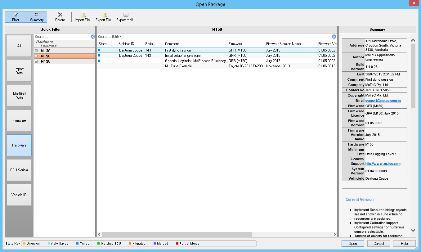 Figure 1. Example Open Package window - Identify and select the required Package using the Package details, filtering and history information available from this window.