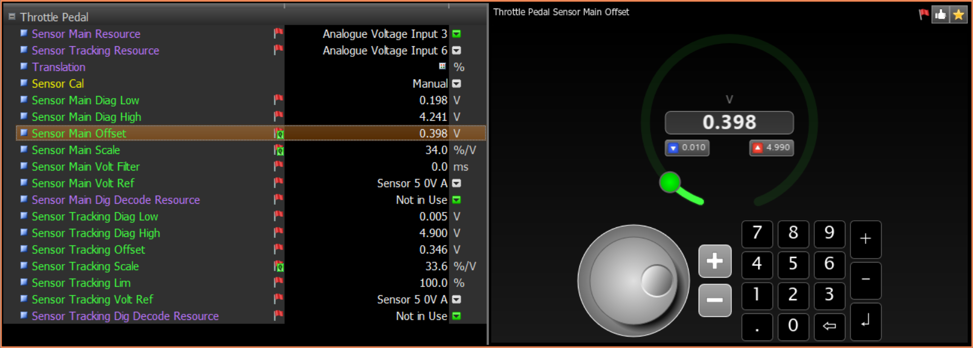 The image below shows the Throttle Pedal Sensor Main Offset calibration in focus.