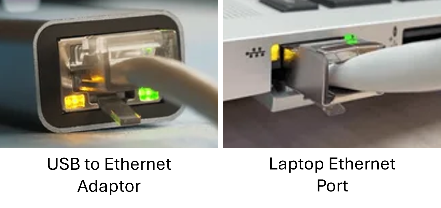 Figure 1. Example Ethernet LED's on a laptop or USB to Ethernet adaptorIf the ECU is powered ON and the lights stay OFF, it most likely indicates