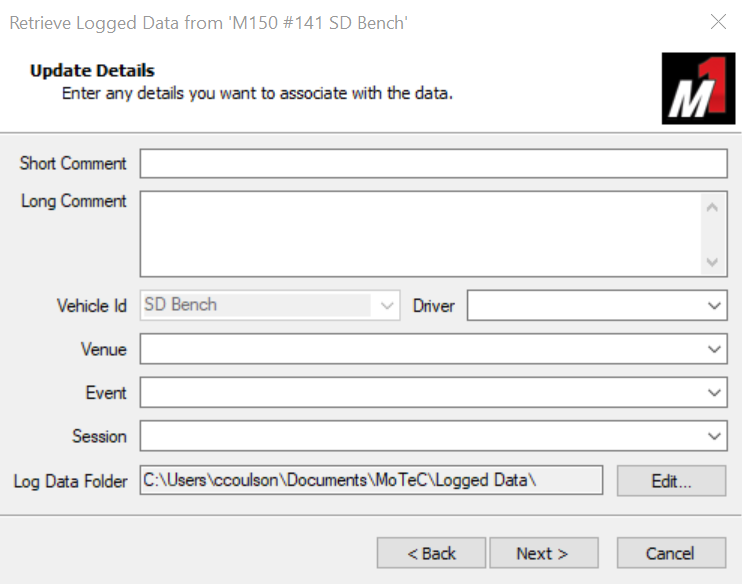 Logged data may be retrieved from the M1 ECU for viewing in MoTeC i2 Data Analysis software.