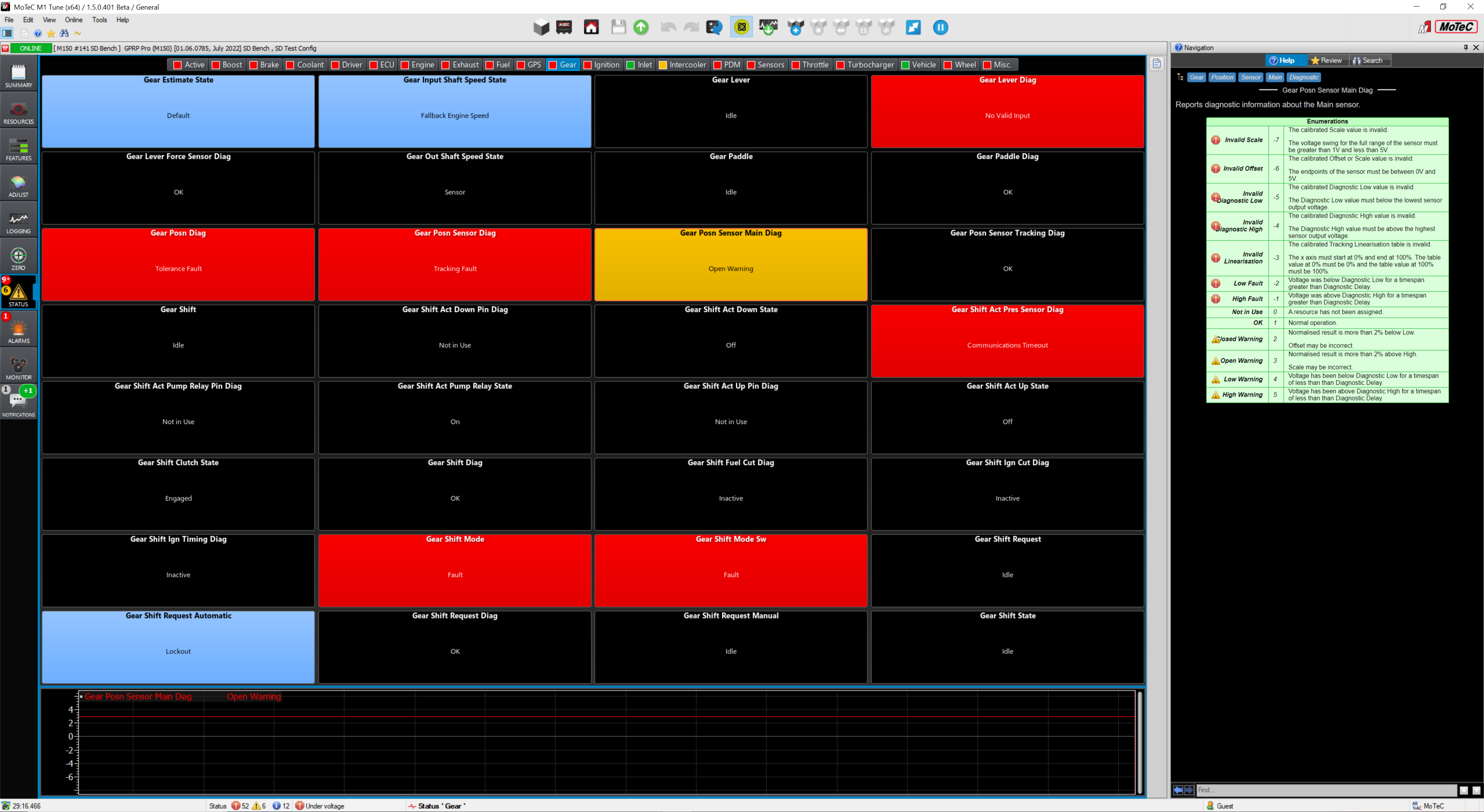 - The Gear Posn Sensor Main Diag channel is shown in the time graph.