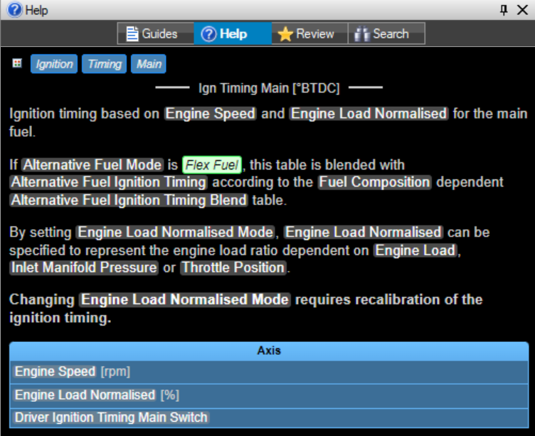 The help can be dynamically navigated, aiding in users understanding of complex control strategies such as torque control or traction control. This dynamic function also allows for the user to be directed to the parameter (or table) that requires configuration by clicking on the name inside the help.