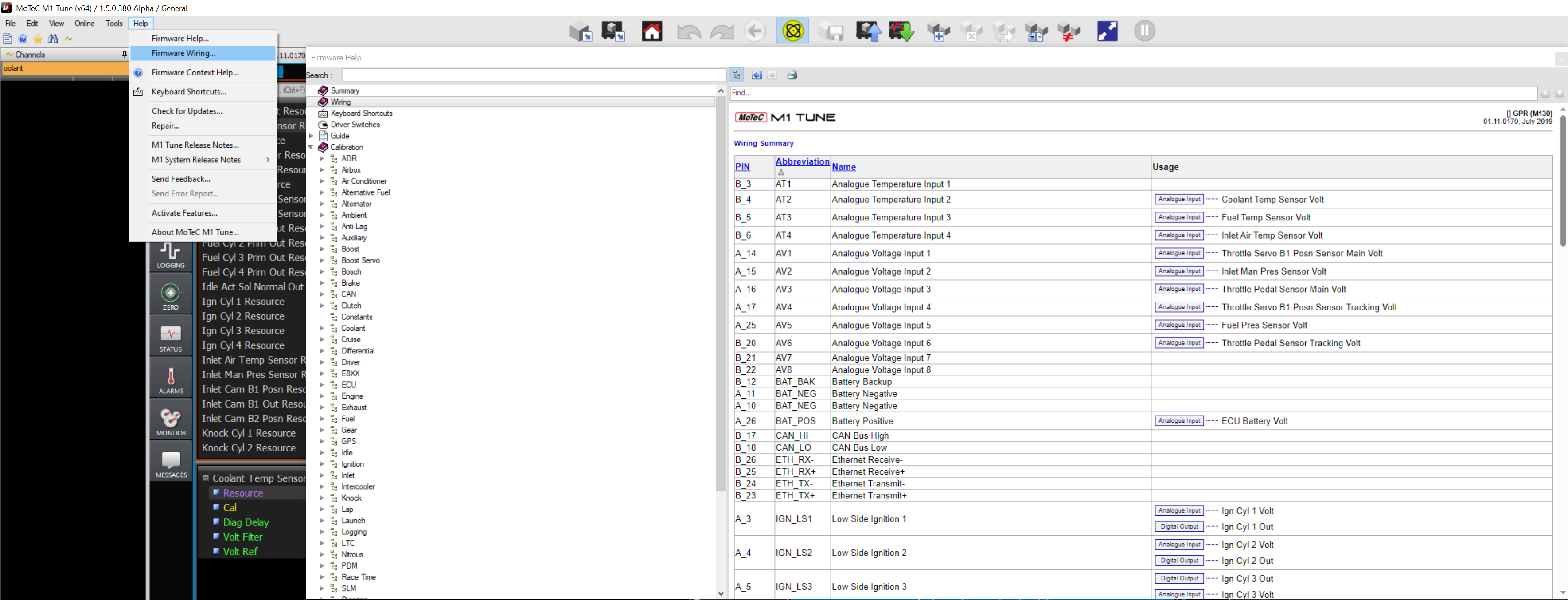 The M1 Wiring Summary shows the pin number assigned for each input and output, along with its abbreviation, name and usage. This list can be printed for reference.